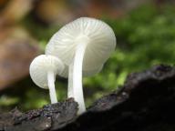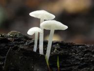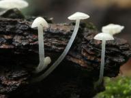 Helmovka přeútlá (Mycena tenerrima) má vločkatý klobouk a třeň vyrůstá z bazálního terčíku.