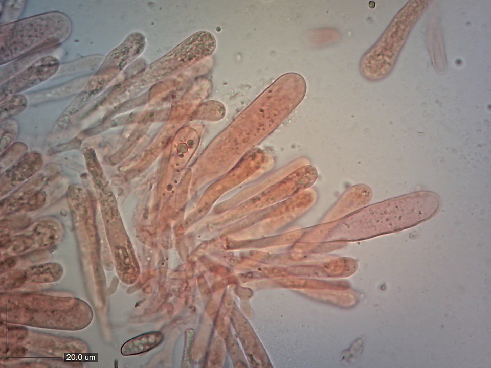 Zralé výtrusy 14,7–19,6 x 4,8–6,3 (průměr 17,6 x 5,5) µm, eliptické, Qav = 3,22. Mikroskopie výtrusů H2O.