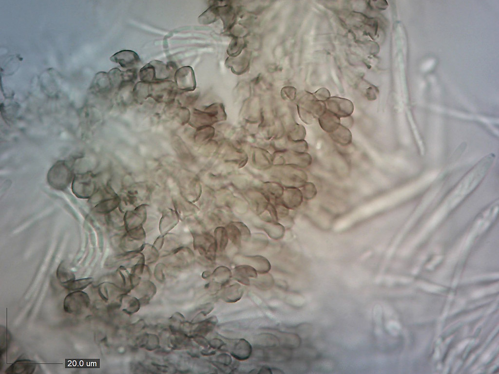 Výtrusy 7,7–13,0 x 2,9–3,4 (průměr 9,6 x 3,1) µm, úzce eliptické, válcovité nebo vřetenovité, průsvitné, nekontrastní, Qav = 3,08. Mikroskopie výtrusů H2O.