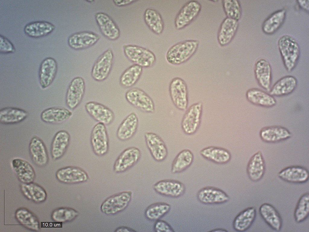 Zralé výtrusy 7,8–10,0 x 4,2–5,2 (průměr 8,8 x 4,6) µm (Qav = 1,89), eliptické, průsvitné. Mikroskopie výtrusů H2O.