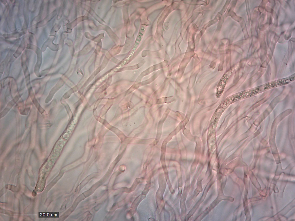 Brvy v pokožce klobouku někdy nápadně dlouhé, přehrádkované, dlouhé brvy jen slabě větvené, průměr obvykle 3–5 µm. Dermatocystidy někdy velmi dlouhé, štíhle kyjovité, většinou nepřehrádkované, 50–120 (více) x 4–7 µm. Cystidy na lupenech štíhle vřetenovité, často s přívěškem (zobánkovité), typicky 40–50 x 8 µm, zobánek dlouhý až 7 µm.