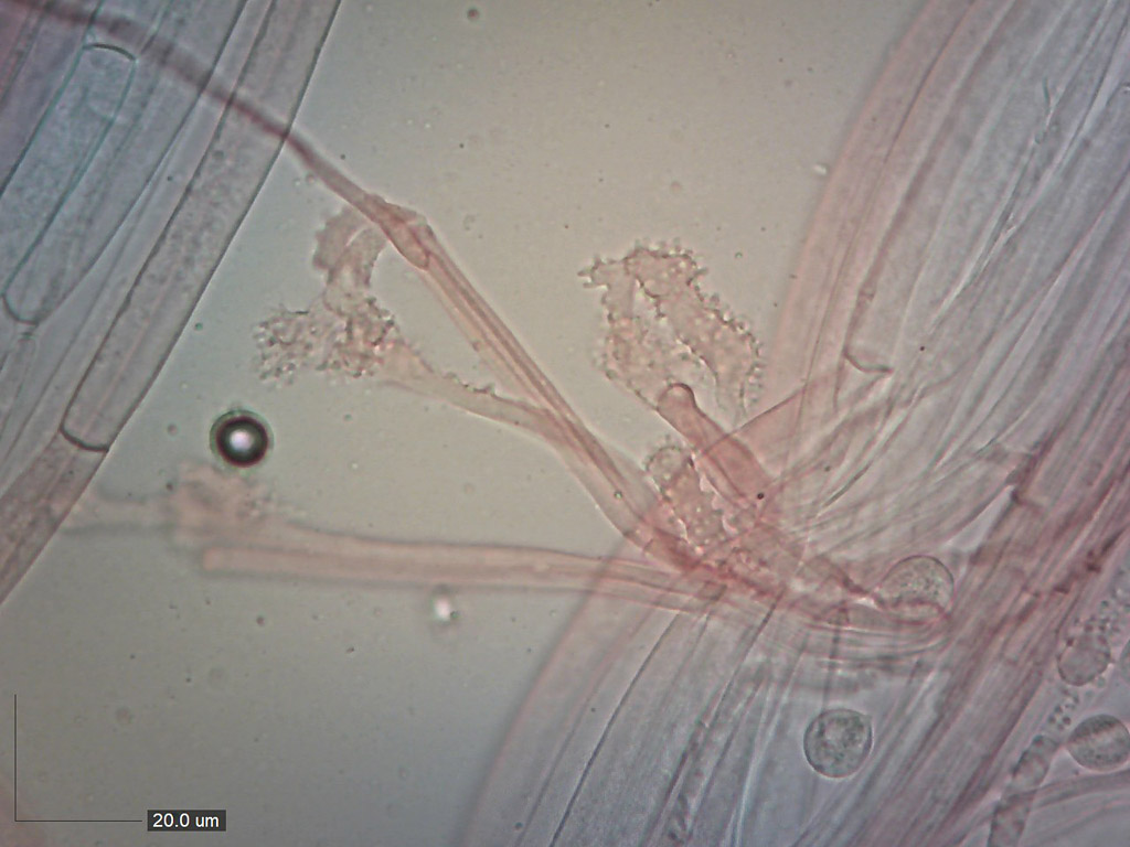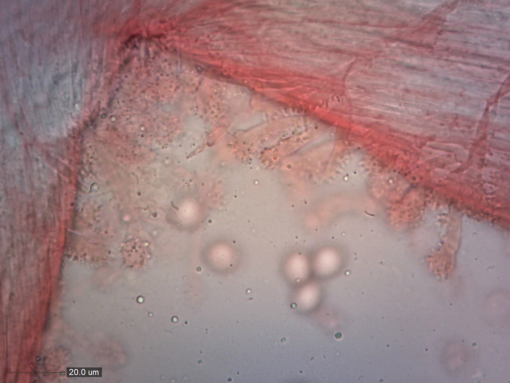 Zralé výtrusy 10,3–13,8 x 9,4–12,0 (průměr 12,2 x 10,9) µm (Qav = 1,12). Mikroskopie výtrusů H2O.