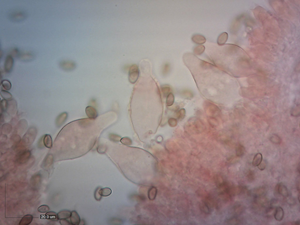 Zralé výtrusy 7,9–9,9 x 4,7–5,5 (průměr 8,7 x 5,1) µm (Qav = 1,7). Mikroskopie výtrusů H2O.