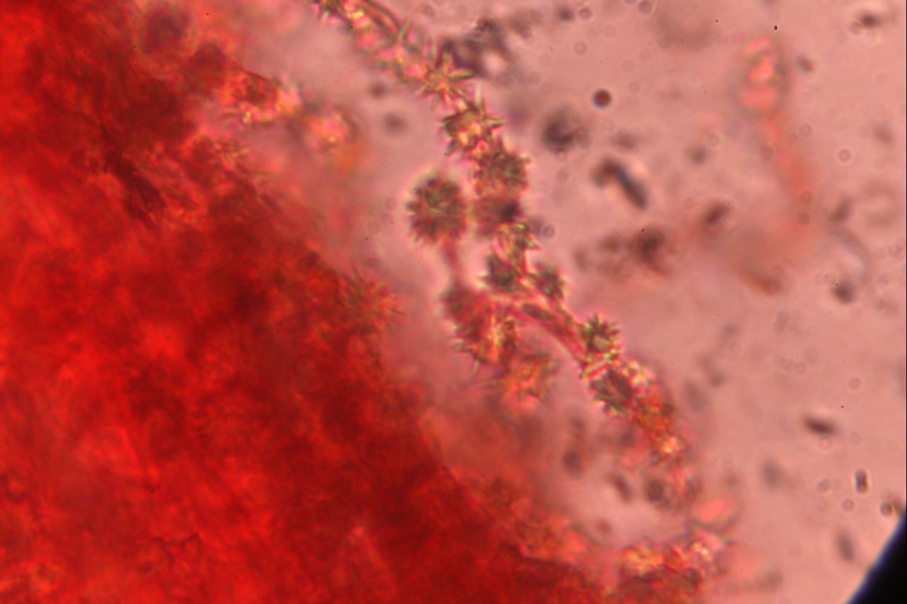 Houby rostly, pršelo. Okrově zbarvené plodnice s bílým myceliem. V celé plodnici jsou hyfy s přezkami. Na myceliu je hvězdicová inkrustace. Výtrusy jsou nejmenší u rodu Ramaria. Ostnité a široce elipsoidní. U této položky 3,5–4,5 (5) x 2,5–3 µm.
