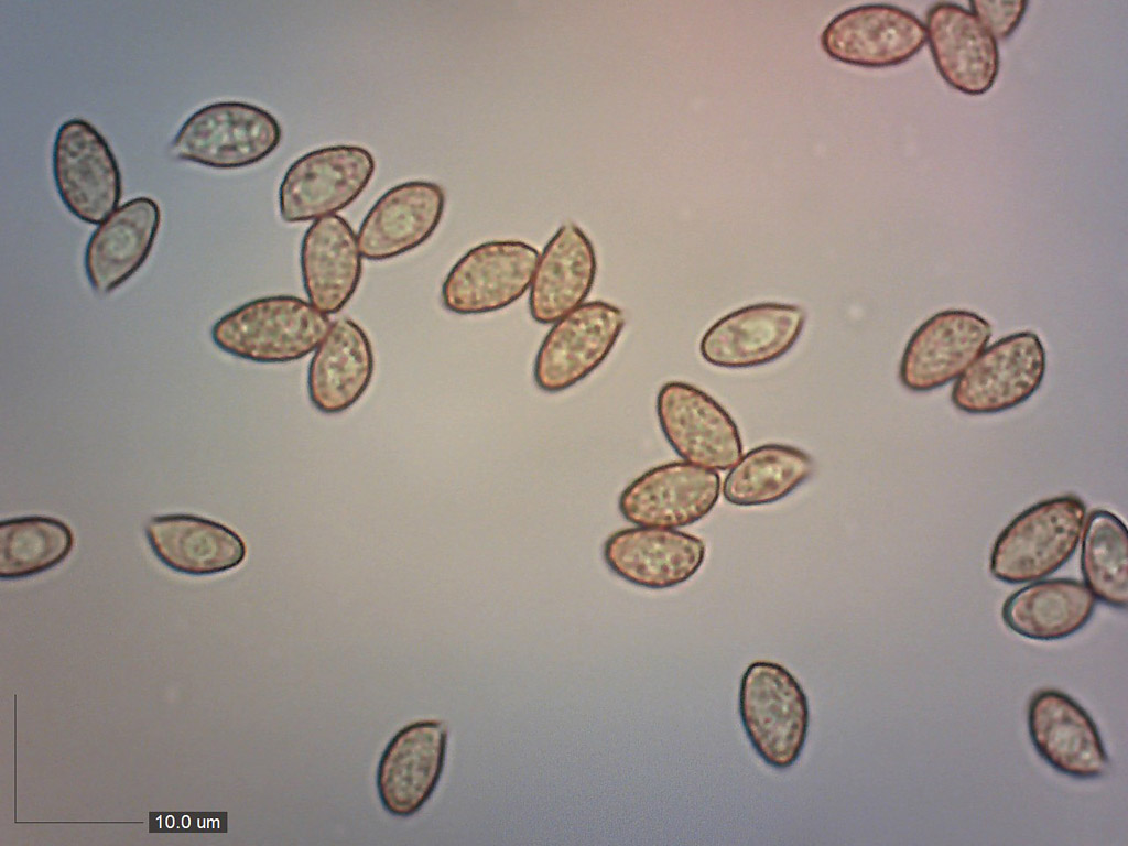 Zralé výtrusy 7,4–8,9 x 4,2–5,1 (průměr 8,1 x 4,7) µm (Qav = 1,7). Mikroskopie výtrusů H2O.