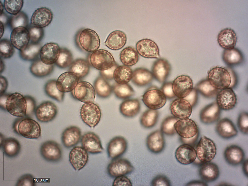 Zralé výtrusy 7,6–9,1 x 6,1–7,4 (průměr 8,4 x 6,7) µm (Qav = 1,26). Mikroskopie výtrusů H2O.