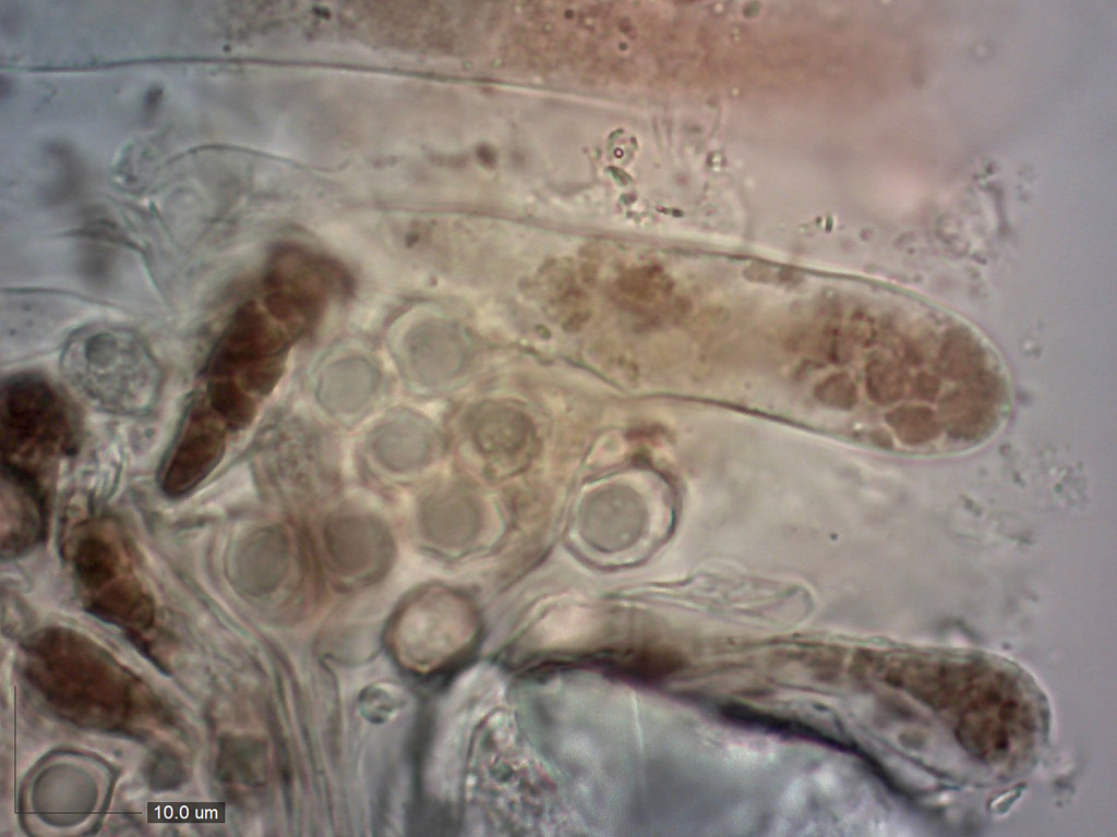Bazidie 4výtrusé, typicky 25–45 x 8–11,5 µm, přezky pravděpodobně přítomny, avšak nevýrazné. Hymeniální cystidy chybí. Obsah buněk pokožky klobouku pigmentován tmavými hnědými zrníčky, velkými někdy až 4 µm.