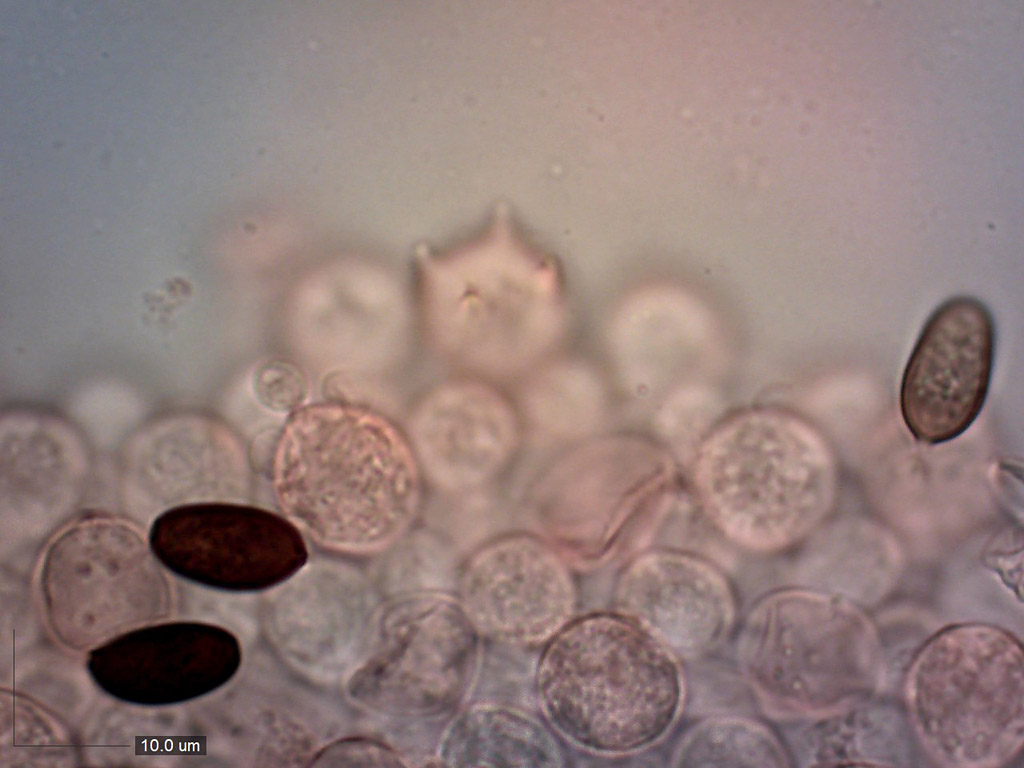 Zralé výtrusy 11,9–14,9 x 6,4–7,7 (průměr 13,5 x 7,1) µm (Qav = 1,9). Mikroskopie výtrusů H2O.