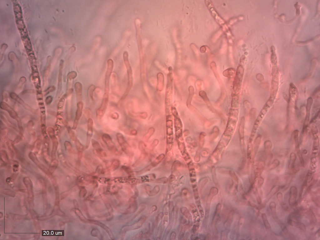 Zralé výtrusy 6,5–8,2 x 5,3–7,0 (průměr 7,4 x 6,1) µm (Qav = 1,2). Mikroskopie výtrusů Melzerovo činidlo.
