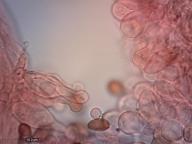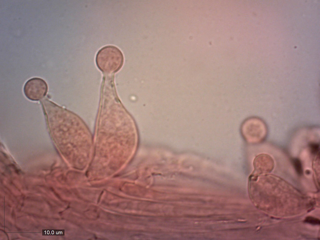 Cheilocystidy typicky 20–30 x 9–13 µm, s hlavičkou o průměru 5–7 µm. Kaulocystidy obdobné, možná o něco větší. Na pokožce třeně i široce kyjovité buňky. Bazidie 4výtrusé.