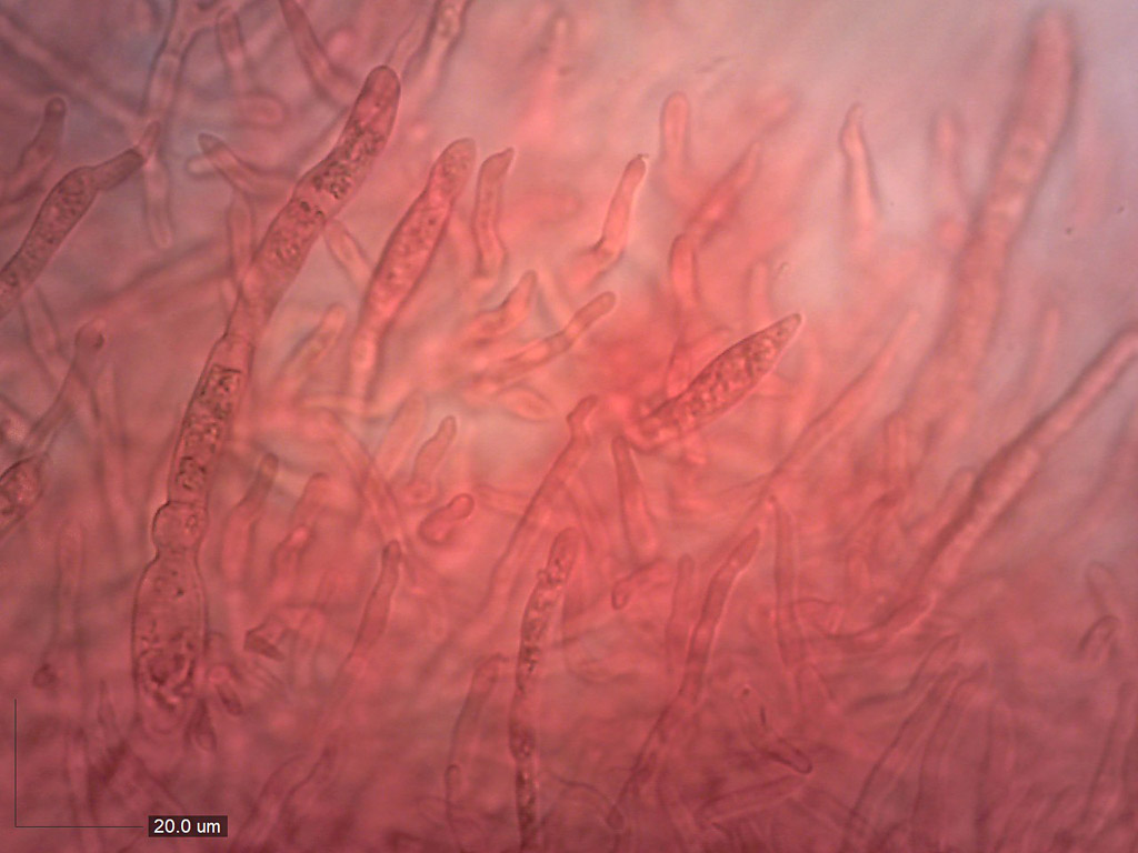 Zralé výtrusy 6,9–8,8 x 6,0–7,8 (průměr 8,0 x 6,8) µm (Qav = 1,2). Mikroskopie výtrusů Melzerovo činidlo.