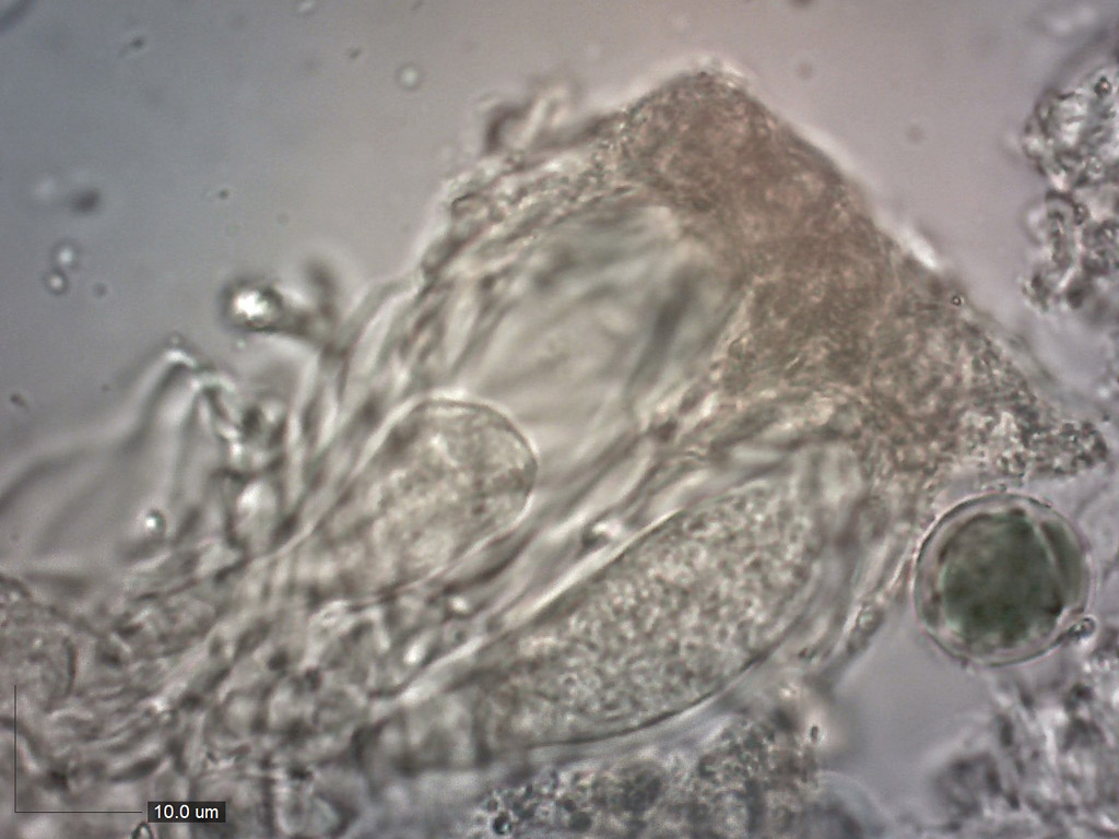 Mikroskopicky pravděpodobně detekovány parafýzy a vřecka, ovšem bez výtrusů.