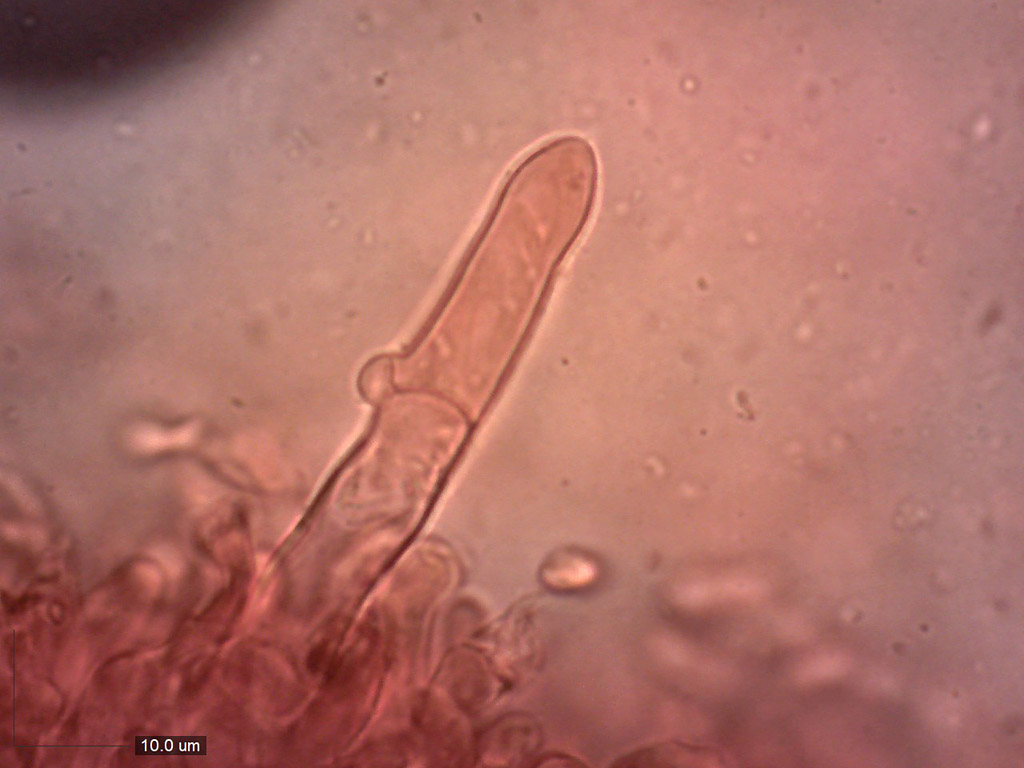 Doplňující mikroskopie k nálezu 0066-2021-0001. Výskyt hymeniálních cystid zdobených (ne vždy) vyloučenými krystaly potvrzuje určení Hyphoderma setigerum.