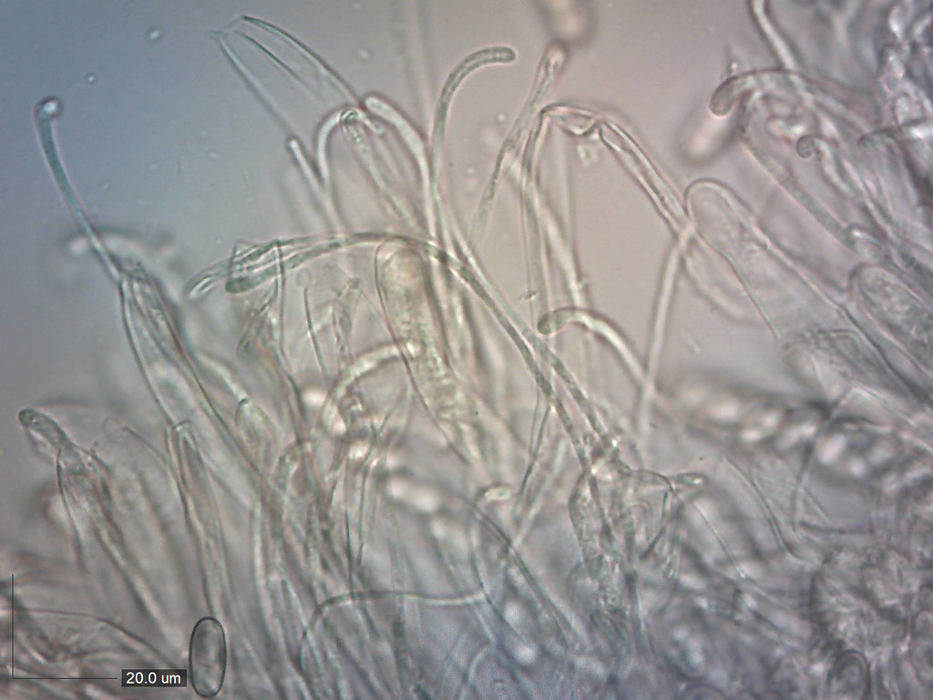 Zralé výtrusy 14,1–16,3 x 6,8–8,2 (průměr 15,2 x 7,5) µm (Qav = 2,0). Mikroskopie pro měření výtrusů H2O.