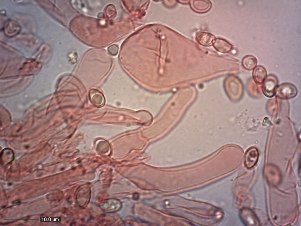 Zralé výtrusy 6,2–7,9 x 4,4–5,5 (průměr 6,8 x 4,8) µm (Qav = 1,4). Mikroskopie pro měření výtrusů H2O.