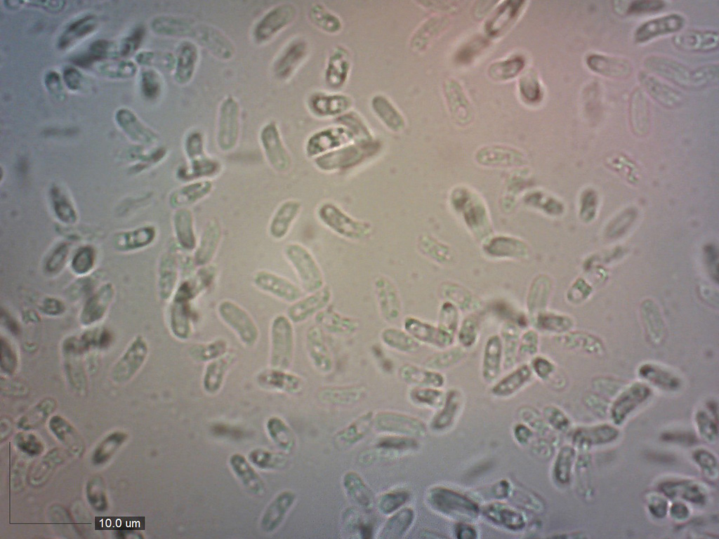 Zralé výtrusy 5,1–6,9 x 1,8–2,5 (průměr 6,0 x 2,2) µm (Qav = 2,8). Mikroskopie pro měření výtrusů H2O.