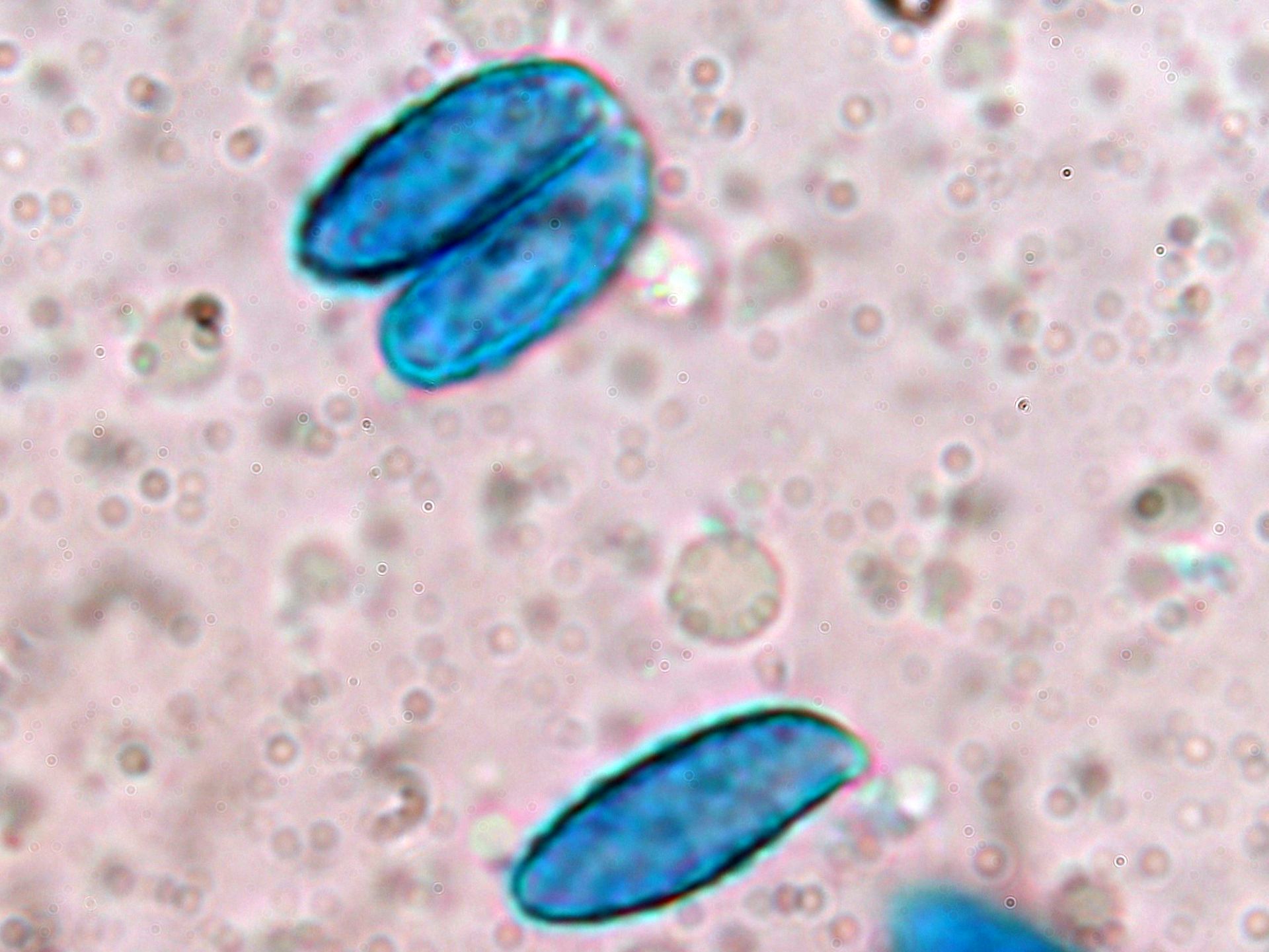 V celé plodnici nejsou přezky. BAZÍDIE tetraspórické, bez bazální přezky 55 - 56 x 11 - 13 µm, VÝTRUSY elipsoidní až cylindrické, bradavčité většinou jsou bradavky izolované, jen málo jsou pospojované do výdutí 11 - 14 (15) x (4) 4,5 - 6 µm X = 13 X 5,1µm Q = 2,5