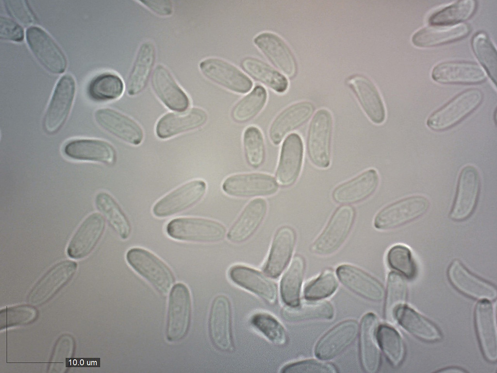 Zralé výtrusy 8,8–11,5 x 3,5–4,3 (průměr 9,9 x 3,9) µm (Qav = 2,6), válcovité, alantoidní. Mikroskopie pro měření výtrusů H2O.