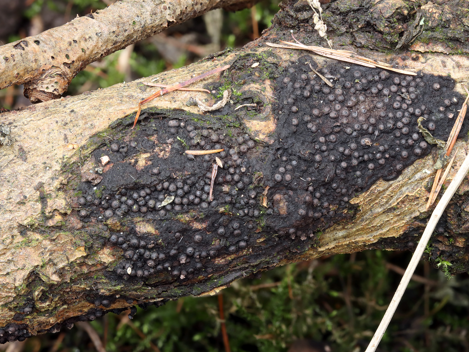 Na hromadě odřezaných větví, pravděpodobně jasanu. Plodničky (perithecia) vyrůstala z nápadně vyvinutého subikula.