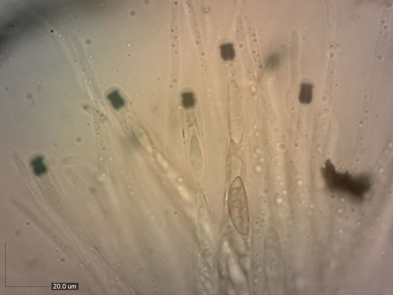 Ve vřecku je 8 výtrusů. Nezralé výtrusy průsvitné, po dozrání velmi tmavé, často s rýhou. Výrazně amyloidní apikální (vrcholová) část vřecka. Parafýzy výrazně delší než vřecka.