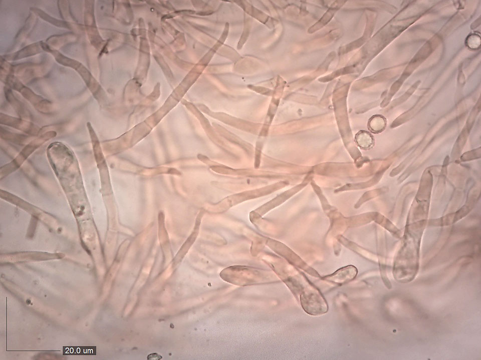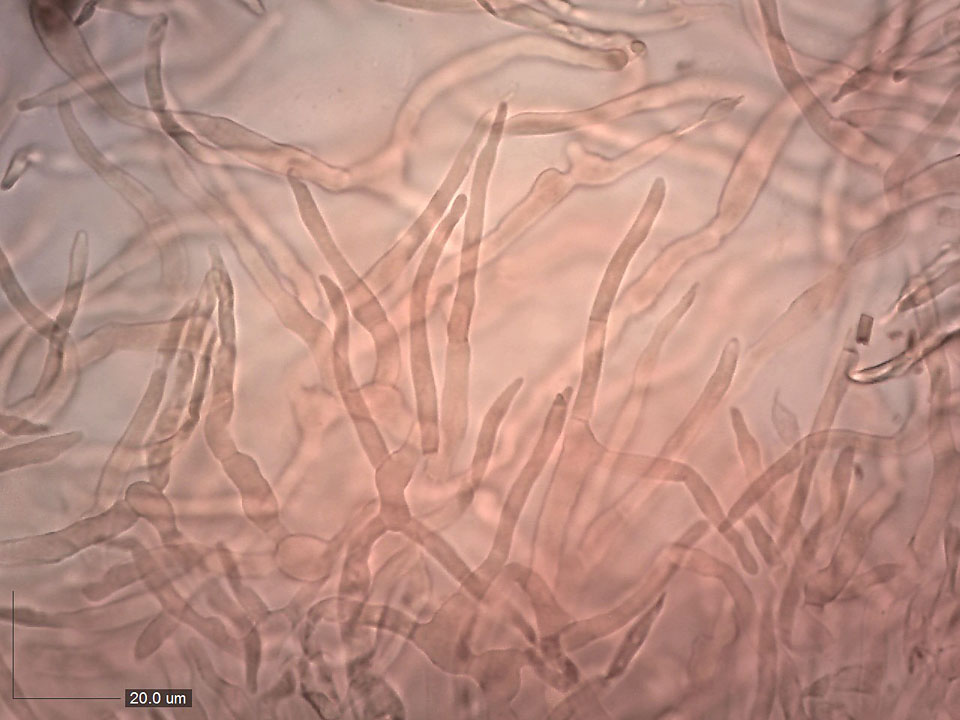 Mikroskopie pokožky klobouku ze suché plodnice. Brvy 3–6 µm, větvené, přehrádkované, obvykle zašpičatělé. Dermatocystidy dlouhé, kyjovité, přehrádkované, v nejširším místě široké 5–10 µm.