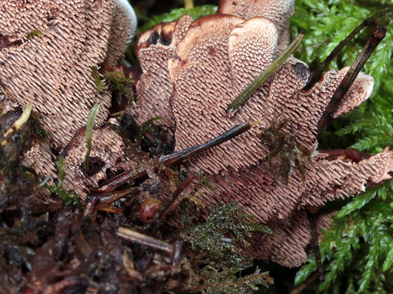 Plodnice tvořena nadzemní a podzemní částí. Nadzemní část plodnice tvořily klobouky s ostny asi 30 mm vysoké a 20–30 mm široké, u mladších plodnic byla šířka klobouku přibližně 10 mm. Bez vůně. Podzemní část skrytá ve spadaném jehličí byla velmi tuhá, místy s lesklou pokožkou, vysoká asi 30 mm.