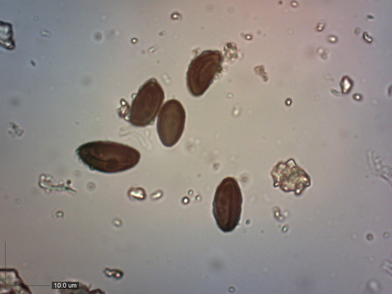 Výtrusy 10,0–12,5 x 5,7–6,7 (průměr 11,3 x 6,2) µm (Qav = 1,8). Mikroskopie pro měření výtrusů H2O.