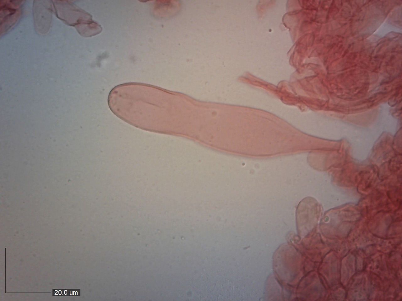 Bazidie 4výtrusé, spíše vzácné mezi kulovitými buňkami hymenia. Hymeniální cystidy (cheilocystidy i pleurocystidy) mohutné, válcovité, oble vřetenovité nebo lahvovivé, někdy s náznakem hlavičky, typicky 80–120 x 20–30 µm. Pokožka klobouku z kulovitých buněk širokých 20–40 µm, bez set. Na hyfách třeně (snad) vzácně přezky.