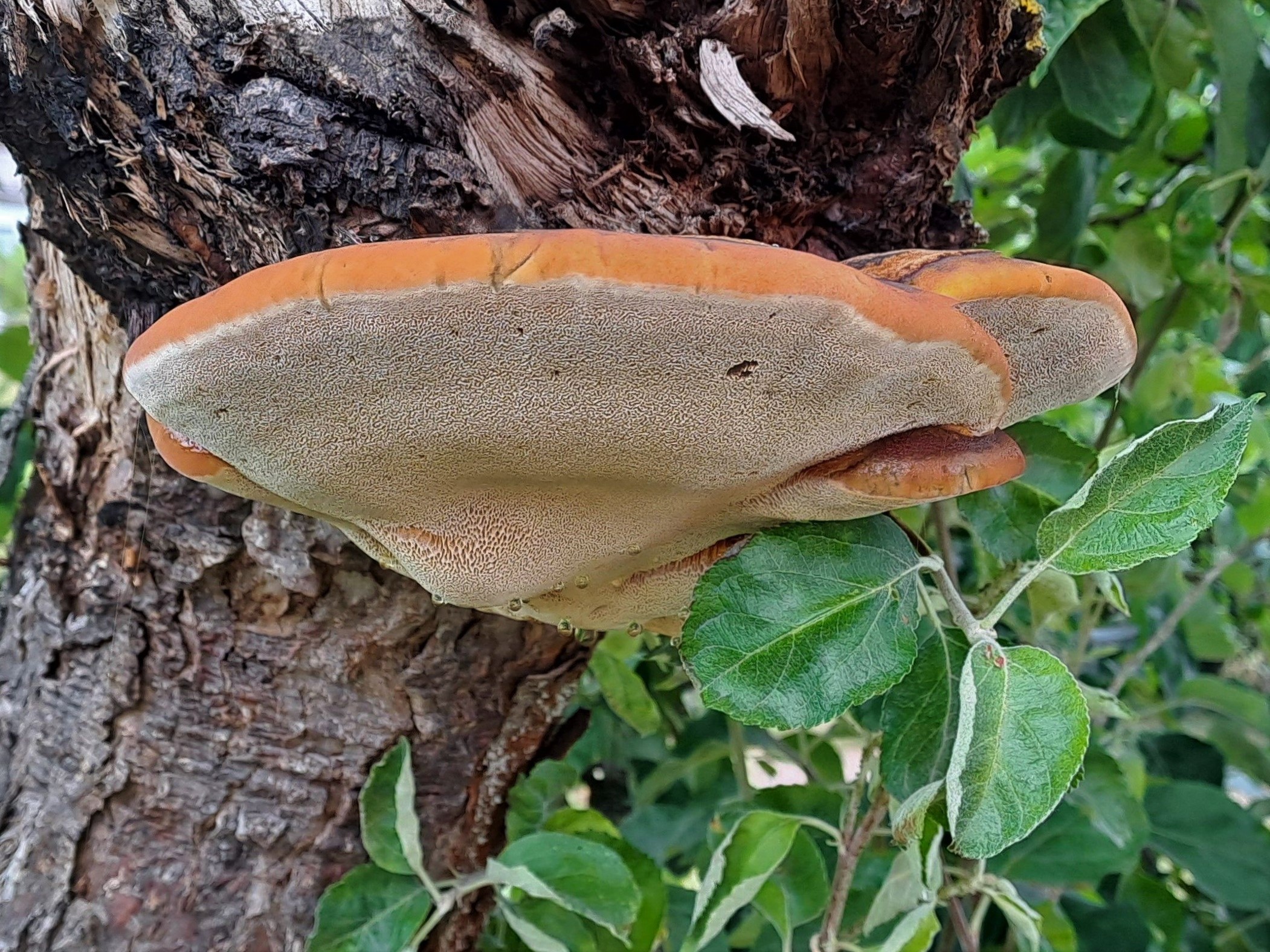 Na jabloni v ovocném sadu. Typické plodnice. Stejná plodnice fotografovaná mobilem a zrcadlovkou z ruky, pro porovnání.