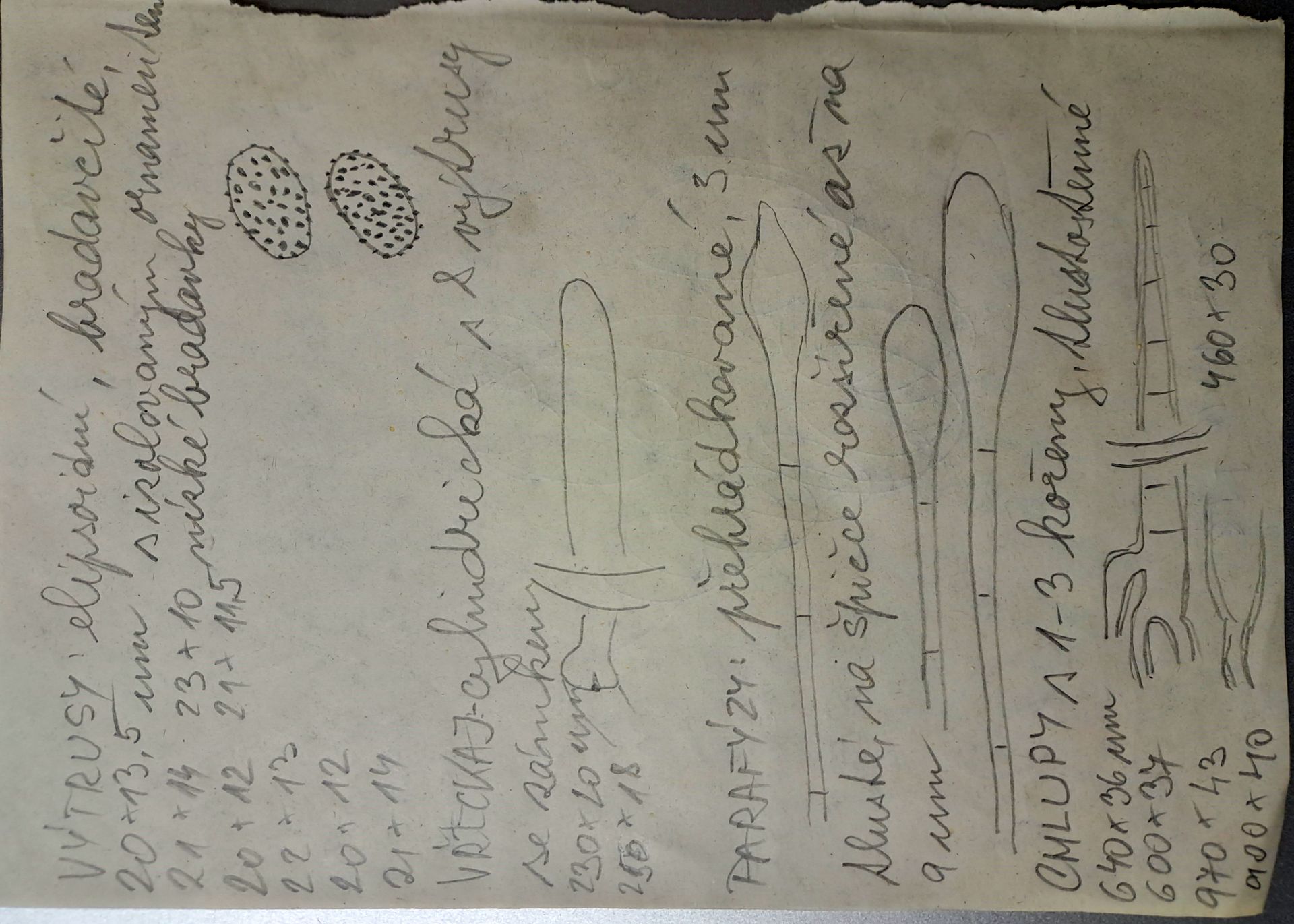 Několik plodnic na smrkových šiškách ve vlhkém příkopu u lesní cesty. Určeno pomocí mikroskopu. VÝTRUSY elipsoidní s nízkými (do 0,5µm) izolovanými bradavkami VŘECKA cylindrická 8 výtrusá J- 230 - 250 x 18- 20 µm se zámkem PARAFÝZY delší než vřecka přehrádkované 3 µm tlusté, na vrcholu rozšířené až k 9 µm CHLUPY tlustostěnné, přehrádkované málo kořenaté s 1 - 2 (3) kořeny 460 - 970 µm dlouhé.