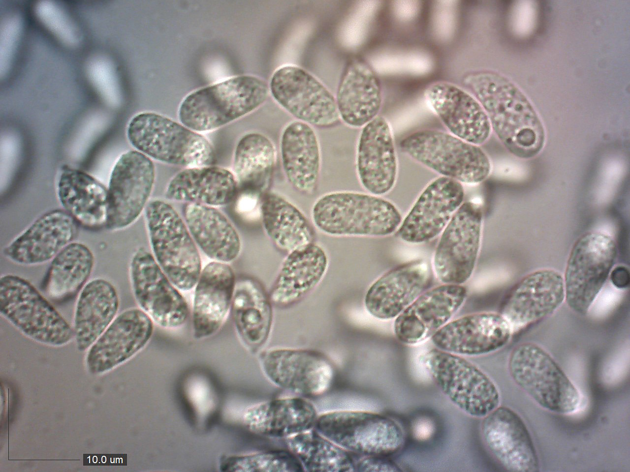 Zralé výtrusy 9,3–13,1 x 4,9–6,2 (průměr 11,0 x 5,4) µm (Qav = 2,0). Mikroskopie pro měření výtrusů H2O.