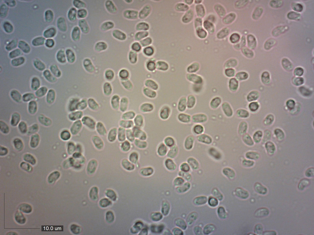 Zralé výtrusy 3,5–4,4 x 2,1–2,7 (průměr 4,0 x 2,4) µm (Qav = 1,7). Mikroskopie pro měření výtrusů H2O.