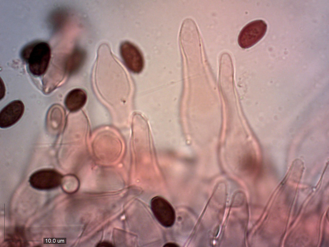Zralé výtrusy 8,9–9,9 x 4,9–5,7 (průměr 9,3 x 5,3) µm (Qav = 1,8). Mikroskopie pro měření výtrusů H2O.