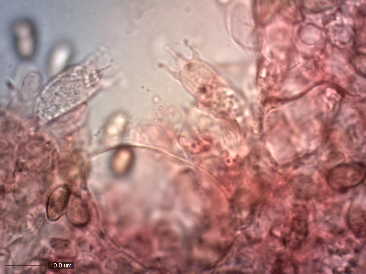 Zralé výtrusy 7,8–10,4 x 4,2–5,6 (průměr 9,1 x 4,8) µm (Qav = 1,9). Mikroskopie pro měření výtrusů H2O.