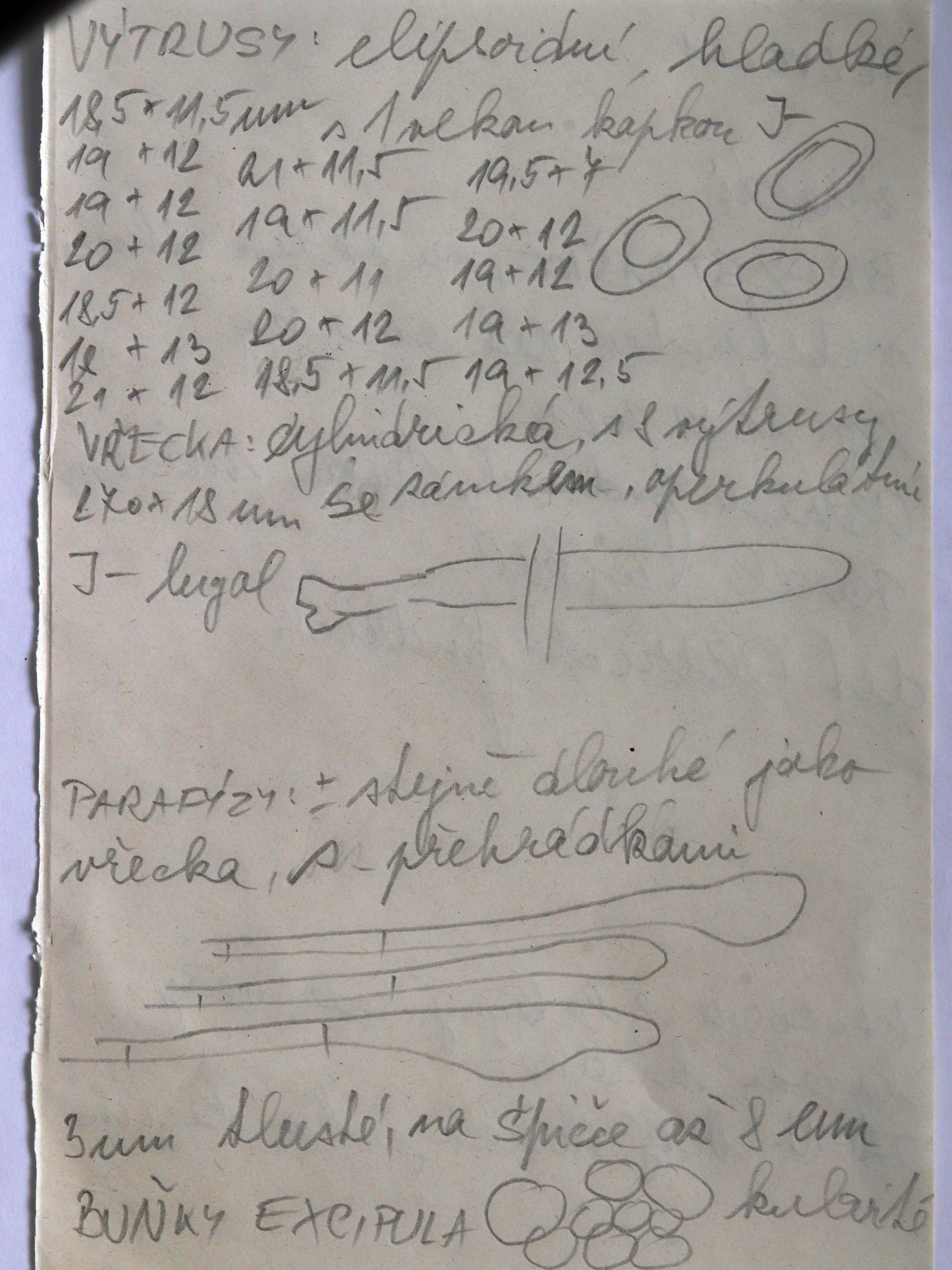 V opadu smrků a v mechu při okraji lesní silnice. Drobné plodnice, třeň bílý, hladký 25 MM dlouhý, klobouk šedohnědý třílaločnatý s podvinutým okrajem. VÝTRUSY J- široce elipsoidní s 1 velkou kapkou 18 - 21 x 11 - 13 µm. VŘECKA J- cylindrická s 8 výtrusy, operkulátní kolem 270 x 18 µm. Parafýzy +- stejně dlouhé jako vřecka, přehrádkované, kolem 3 µm tlusté, na špičce rozšířené na 8 µm. Buňky excipula jsou kulovité.