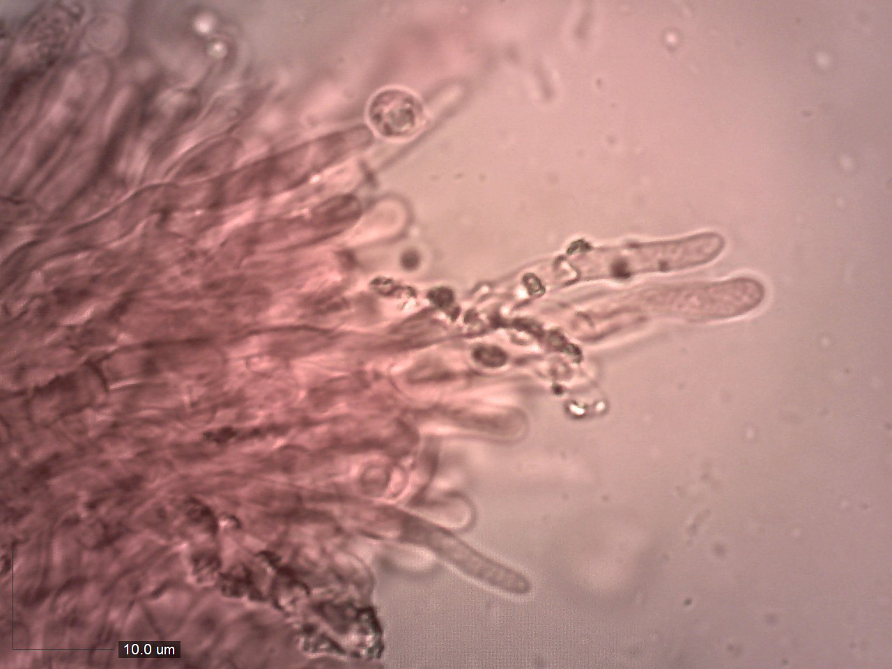 Zralé výtrusy široce oválné 4,1–5,1 x 3,6–4,6 (průměr 4,6 x 3,9) µm (Qav = 1,2). Mikroskopie výtrusů H2O.