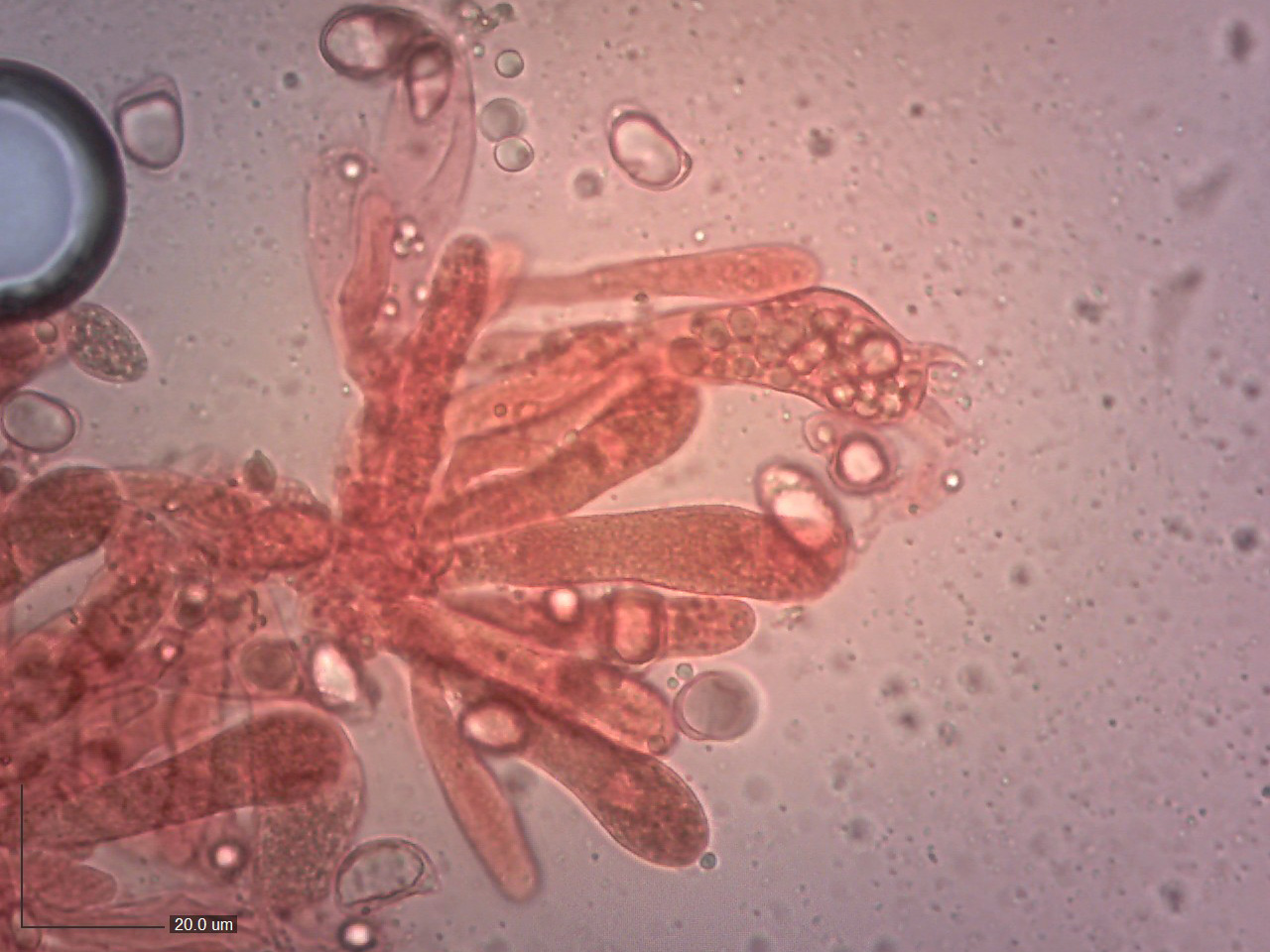 Zralé výtrusy 15,2–17,9 x 9,4–11,0 (průměr 16,1 x 10,3) µm (Qav = 1,6). Mikroskopie pro měření výtrusů H2O.